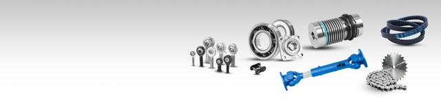 Open transmissions including belt drives, chains and sprockets, shaft couplings, torque limiters, bearings, rods ends, rack modules and spur gears, cardan units and lubricants.